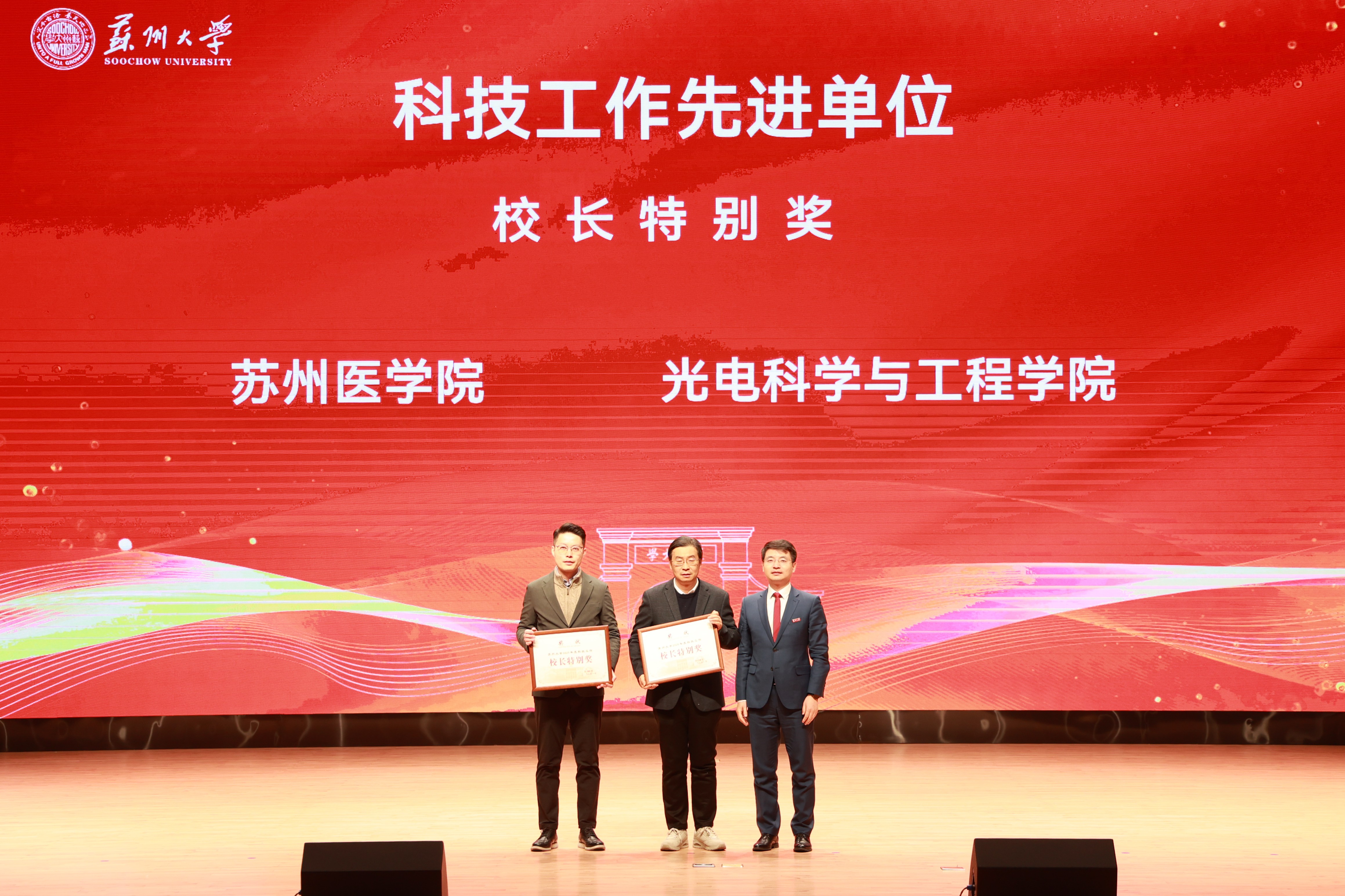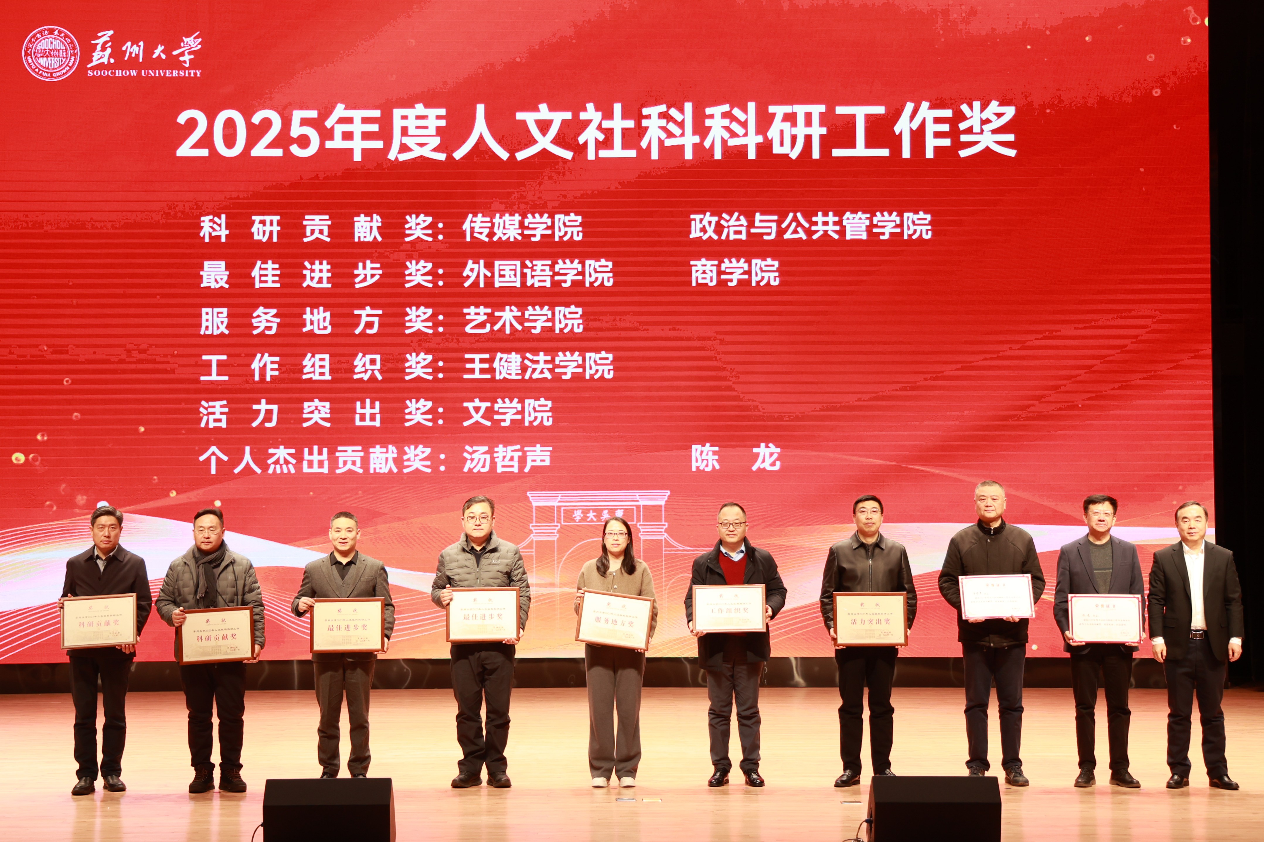校党委常委、副校长张正彪总结了我校“十四五”期间的科研指标完成情况和2025年度人文社会科学与自然科学科研工作情况。他指出,全年人文社科科研基本盘持续稳固,服务国家重大战略实现关键突破,在重大奖项取得、高质量咨政成果、国家级项目立项、特色学术品牌打造、科研创新实践等方面,取得了一系列突出成效。在自然科学领域,基础研究量质齐升,立项数量创历史新高,标志性成果实现重大突破,有组织科技成果转化规范提质。他围绕“十四五”期间重点重大项目获批、科研平台升级、标志性成果产出、产研深度融合、科技成果转化等亮点工作,梳理了学校在承担国家级科研项目、建设平台与人才队伍、探索“双高”协同新模式、提升产业服务能力等方面取得的扎实成效。他强调,在“十五五”规划开篇布局之年,学校要聚焦强化国家和区域战略科研力量,统筹谋划高能级平台建设,对外拓展高层次资源,对内优化整合提升管理服务效能,重点推进文化赋能经济社会发展、深化有组织科研、推动产研融合一体化创新,构建文理工医共融、与苏州地位相匹配的高质量科研发展体系。