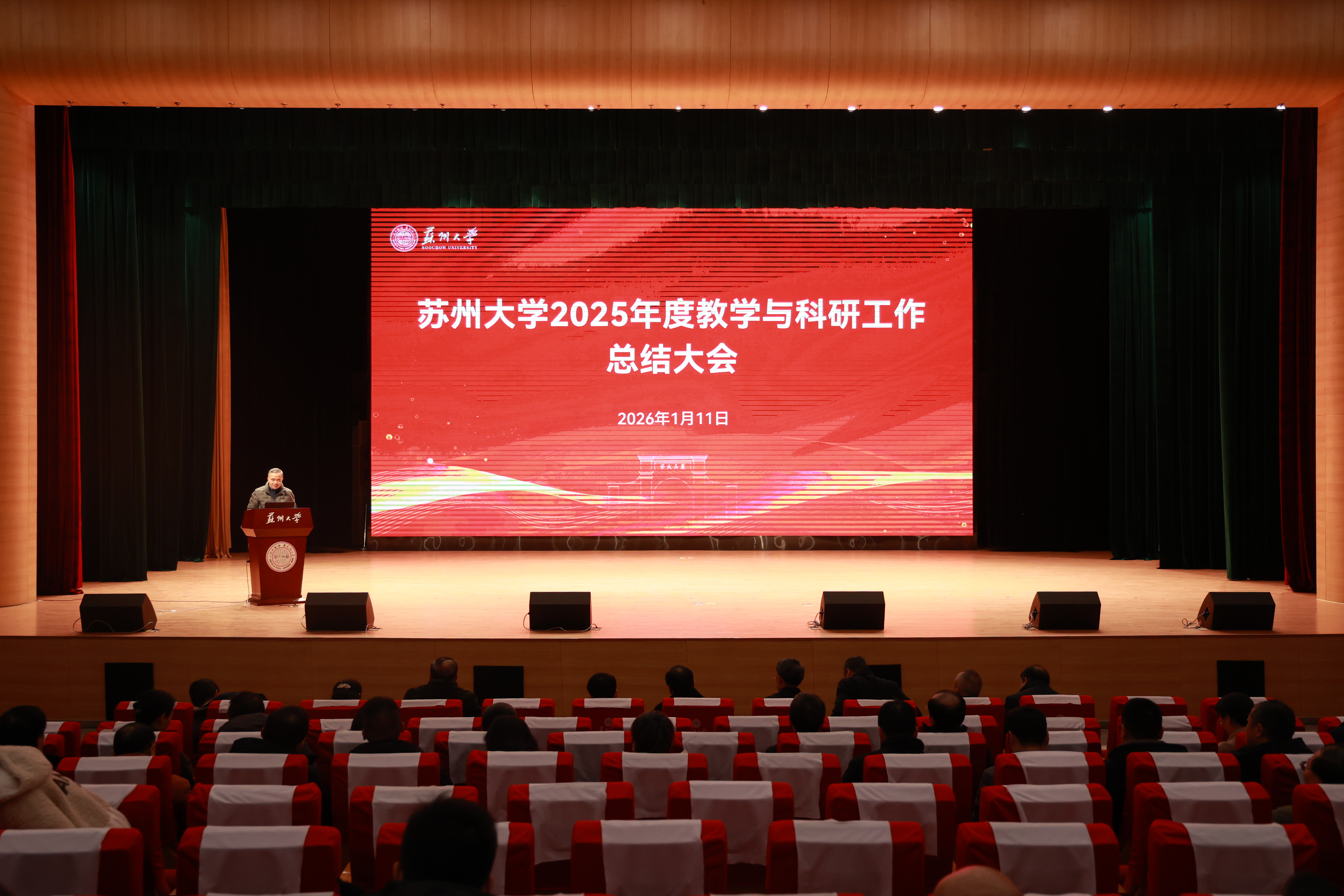 结合学校在办学历程中积淀的精神特质以及苏州“三大法宝”内容,张桥对学校的发展建设提出了“求真务实、聚力扬长、奋楫一流”的工作要求。他强调,“求真务实”是态度,“聚力扬长”是方法,“奋楫一流”是方向,名城名校融合发展战略、人才强校战略和国际化战略是有力抓手,彼此支撑、相辅相成。为实现学校各项事业高质量发展,各单位要继续弘扬“说实话,办实事,求实效”的优良传统,坚持以学生为中心,努力让学生在苏大学习好、生活好、发展好;依托苏州区位优势,以更开放的胸怀面向全球引才,精心培育有潜力的青年人才;以服务地方成效为重要工作标尺,主动对接产业发展、城市定位与文化需求;不断拓展国际合作网络,走出一条有苏大特色的发展之路。展望2026年,希望全校上下保持奋进姿态,紧扣学校发展大局,秉持“求真务实”作风,激发“聚力扬长”智慧,昂扬“奋楫一流”斗志,共同为建设中国特色世界一流大学贡献力量!