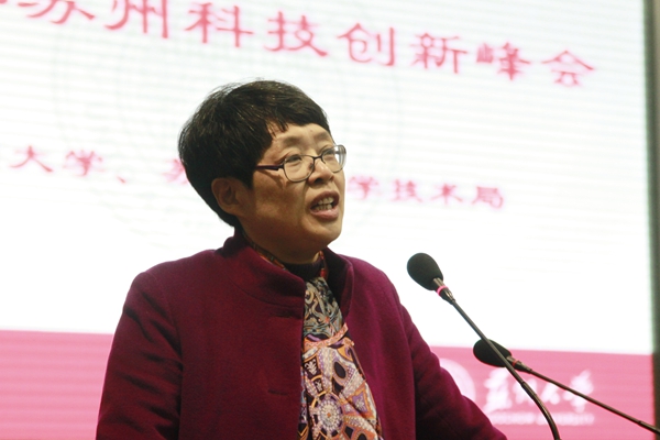 路建美代表学校对参加此次峰会的政府领导、苏州大学代表以及各位企业家表示欢迎和感谢。她肯定了我校大学科技园组织本届训练营及创新峰会对推动苏州科技型企业发展作出的重要作用,介绍了我校对推动苏州创新型城市建设、帮助科技型企业的发展、科技合作、服务等一系列做法以及对未来的创新发展规划进行了展望。