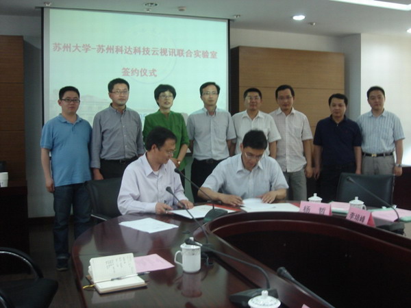 5月22日下午,我校与苏州科达科技股份有限公司联合共建的“苏州大学—苏州科达云视讯联合实验室”签约仪式在法学院会议室举行。苏州科达科技股份有限公司董事长陈冬根、董事长助理徐幼杰、云视讯事业部副总经理刘建荣,我校副校长路建美,张家港市人民政府副市长、科学技术与产业部常务副部长朱巧明,科学技术与产业部科技产业处处长蒋敬东、副处长糜志雄,计算机科学与技术学院院长杨季文,网络中心副主任张庆等出席了签约仪式,签约仪式由蒋敬东主持。