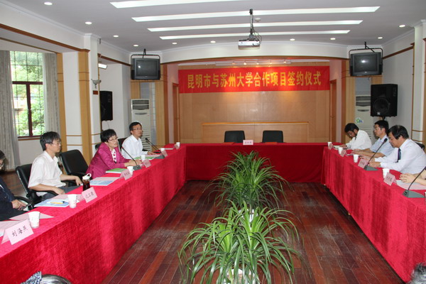 10月16日下午,昆明市与苏州大学合作项目签约仪式在我校红楼会议中心115成功举行。昆明市人民政府副秘书长郭增敏及昆明市科技局、农业局、昆明学院等单位领导,我校副校长路建美、科学技术与产业部及相关研究机构负责人出席会议。签约仪式由科学与产业部科技产业处处长蒋敬东主持。