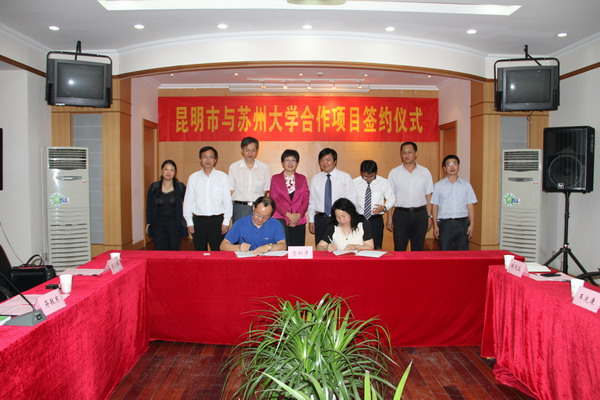 在郭增敏和路建美的见证下,双方代表分别签署了《昆明市科技局与苏州大学科学技术与产业部开展产学研合作协议》、《昆明市农业局与苏州大学蚕桑研究所合作协议》。