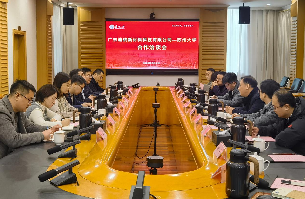为进一步深化产教融合,推动产学研协同创新,搭建高校科研成果与企业产业需求的精准对接平台,2月4日上午,苏州大学与广东迪纳新材料科技有限公司合作洽谈会在我校成功举行。广东迪纳新材料科技有限公司总经理石爱斌、常务副总万可,苏州大学校长张桥、校党委常委、副校长张正彪,以及各相关学院和部门负责人共同参与了此次洽谈。